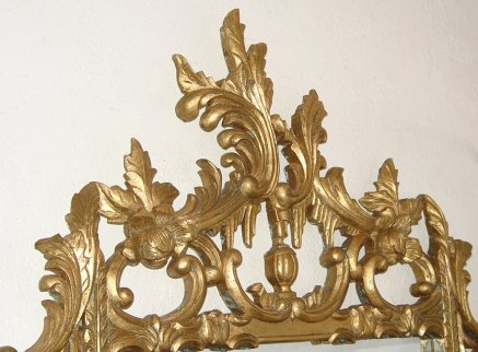 ITALIAN STYLE CARVED GILT WOOD MIRROR: Ornate Rococo style carvings with scrolls and stylized pagodas. 55''h.x 28'' overall. The glass is 31.5'' x 18.5''.