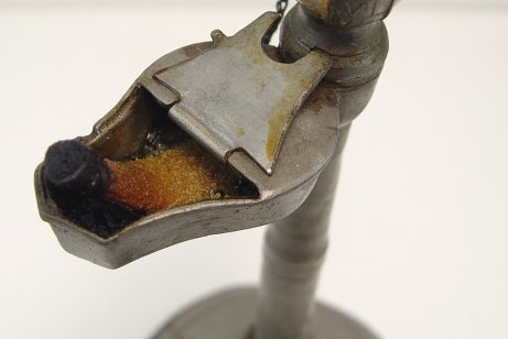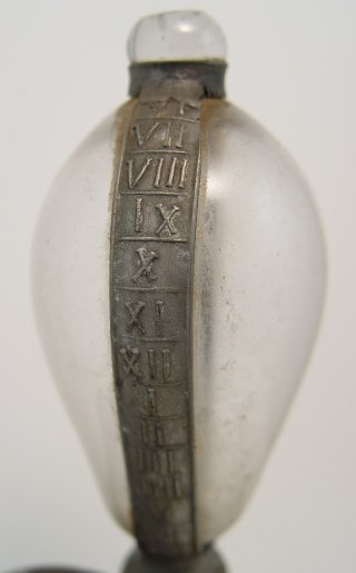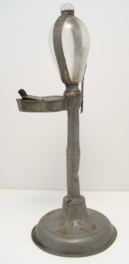 EARLY PEWTER OIL LAMP TIMEKEEPER / FIRE CLOCK: When lit, the level of oil diminishes as time passes. The pewter banding is marked with Roman numerals. 13 3/4''h. The base is 5 1/2'' dia.