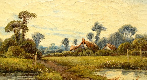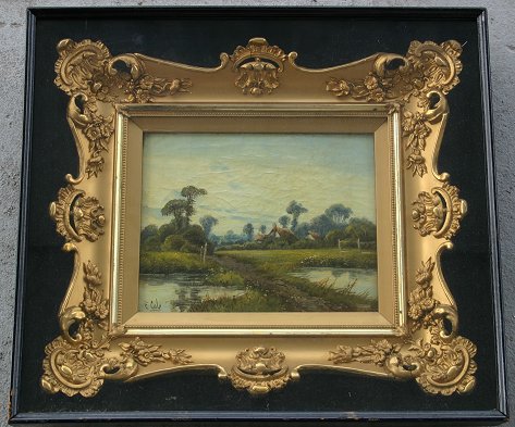 COLE, E., (English, 19th C): Landscape with cottage, O/C, 8'' x 10'', encased in period pierce carved and gilded molding with gold over-paint, inset in a black shadow box under glass, 17'' x 18 3/4''.