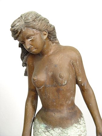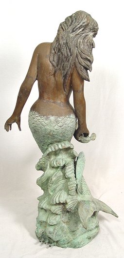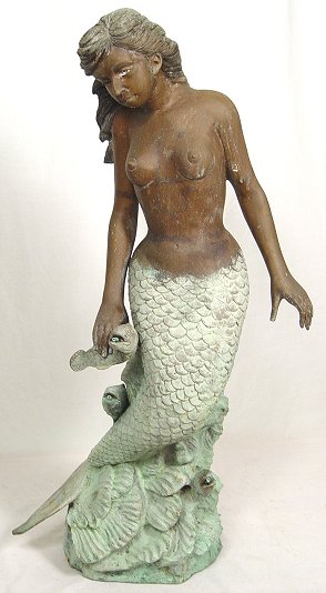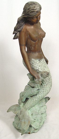 BRONZE NUDE MERMAID FOUNTAIN: In all her glory, the water flows from the fishes mouths. 40''h.