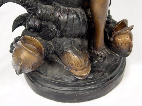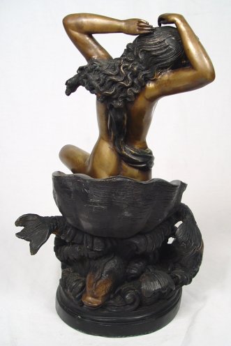 CONTEMPORARY BRONZE SCULPTURE GIRL ON SHELL WITH FISH 21 1/2''h.