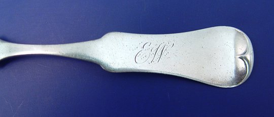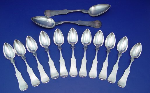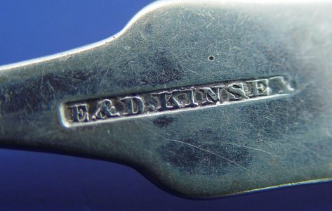 LOT OF 13 COIN SILVER SPOONS: Fiddle back spoons to include two serving spoons, 9 1/4''l. and 11 teaspoons, 6 1/4''l. All marked E & D Kinsey and monogrammed E.W., approx. 12 oz. total.