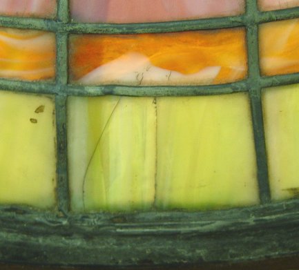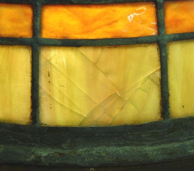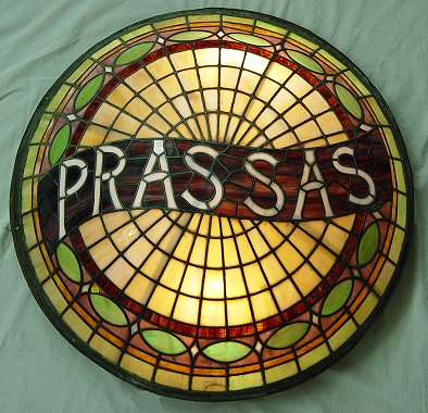 LEADED SLAG GLASS DOME CHANDELIER: Purple, green and caramel with ''Prassas'' bannered across the dome. 38'' dia, 10''h., missing one small green glass.