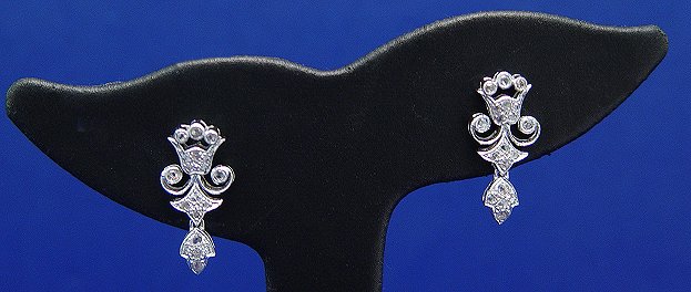 LOVELY DIAMOND DANGLE EARRINGS: Delicate diamond earrings in a crown, scroll and leaf motif, 14k white gold, approx. 38 full cut diamonds weighing approx. .32ctw. & 3/4''l.