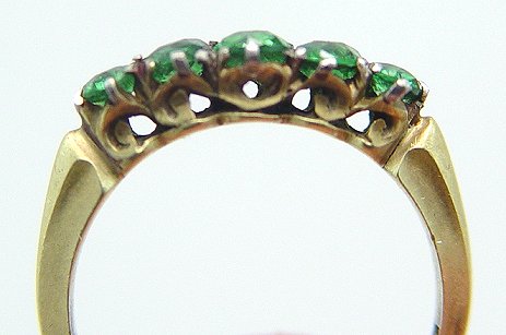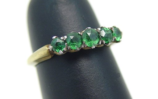 ESTATE TSAVORITE RING: European 18ct deep yellow gold ring set with five round cut tsavorite garnets in graduated sizes - 2.8 & 3mm at ends up to 3.4 in center, marked 18ct 96, size 5 1/4. Est. $300/400**