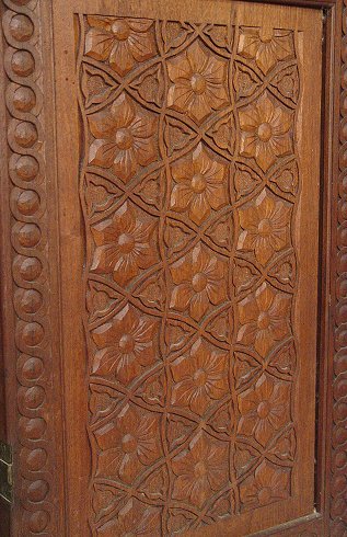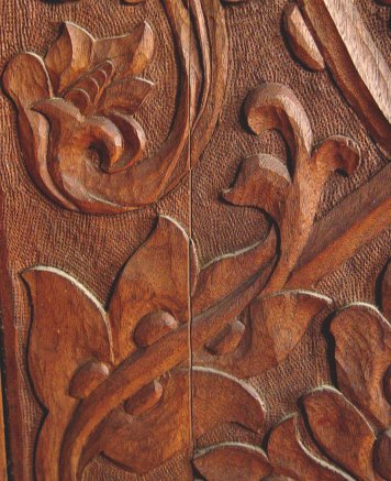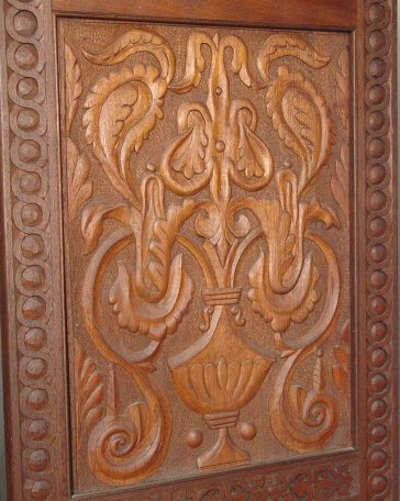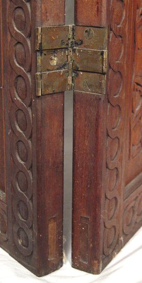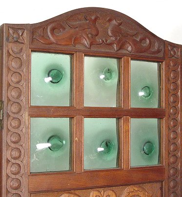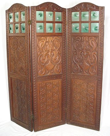 CARVED MAHOGANY 3 PANEL SCREEN: Heavy relief carvings on three panels, each fitted with 6 panes of emerald green glass. 71 1/2'' x 61 1/2''.