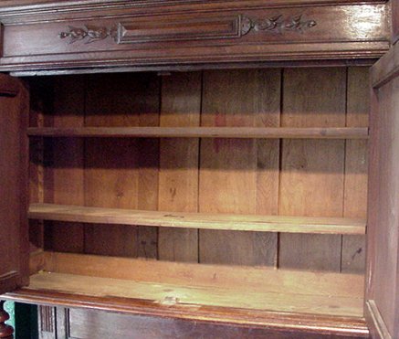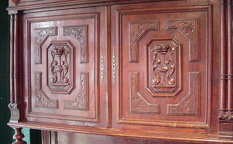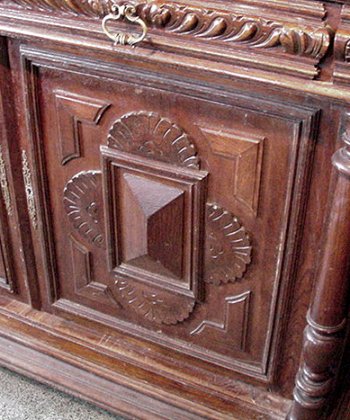 BELGIAN CARVED OAK COURT CUPBOARD: Sideboard with cupboard at upper and lower sections. Turned supports between levels, ample serving surface. 90''h, x 50'' x 24''.