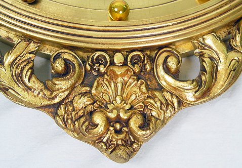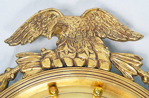 CARVED WOOD BULL'S EYE MIRROR: Gilt and carved wood frame crested with an eagle, convex glass. Some wear to the gold balls surrounding the glass. 20th C. Glass is 17'' dia., 35''h, x 26''w. overall.