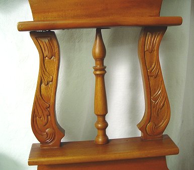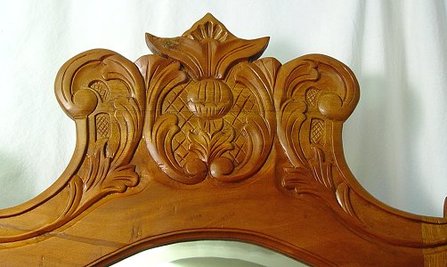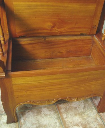 VICTORIAN STYLE CARVED MAHOGANY HALL STAND: Carved crest over beveled mirror, open arm bench with lift top for storage. Approx. 71''h, x 32''w.