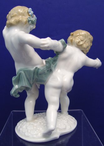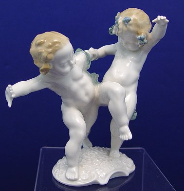 HUTSCHENREUTHER FROLICKING BABIES BY KARL TUTTER: Two babies dance on a bed of flowers. Approx. 6 1/2'' x 6'', marked Hutschenreuther Selb Germany US Zone, impressed K Tutter.