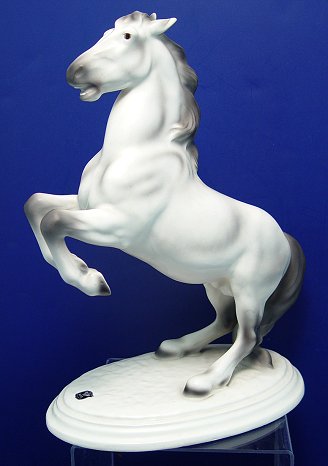 E & R AUSTRIAN PORCELAIN HORSE FIGURE: Rearing white stallion, 12''h, 9'' oval base. E&R foil label. Made in Austria. No chips or cracks.