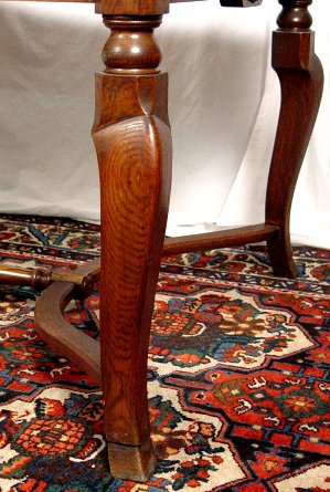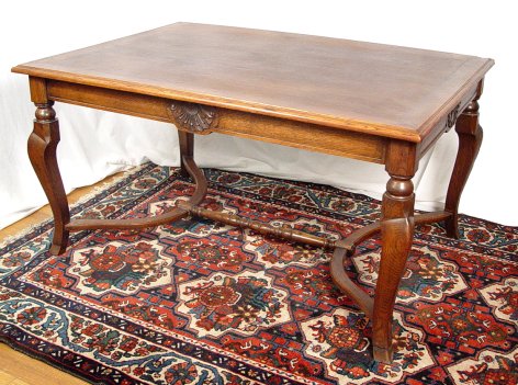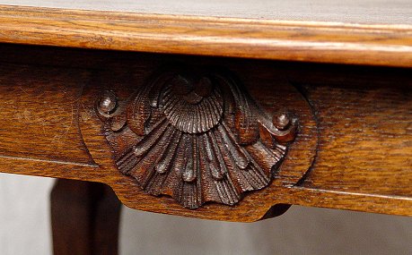 BELGIAN OAK DINING, LIBRARY OR CONFERENCE TABLE: A fine substantial table with carvings centered around the apron, cross stretchers. Pull out supports give one the option of adding leaves. 40 1/2'' x 58''.