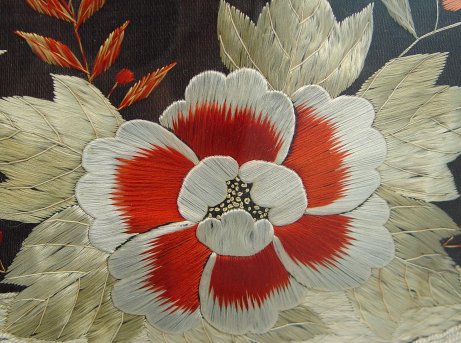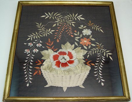 19TH C FOLK ART EMBROIDERY: Floral basket hand worked in silk threads on a black ground. Framed under glass. Unsigned. 18 1/4'' x 17 1/2'' overall. Gilt 3/4'' frame. No visible holes or rips.