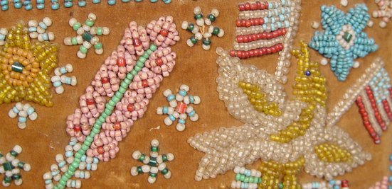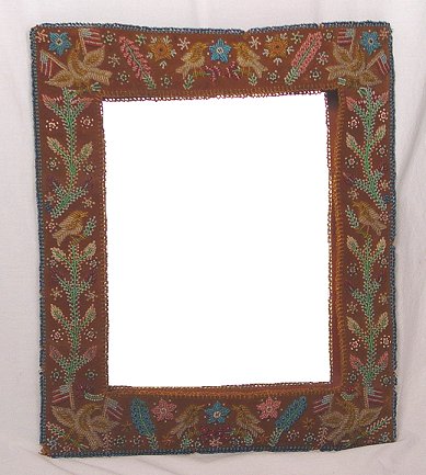 LARGE VICTORIAN EMBROIDERED BEADWORK FRAME: American flag, bird and floral motif beadwork embroidered on velvet. Pocket type frame holds a mirror. Minor bead loss and wear along the edges. 27'' x 23 1/4'', interior is 18 1/2'' x 14 1/2''.