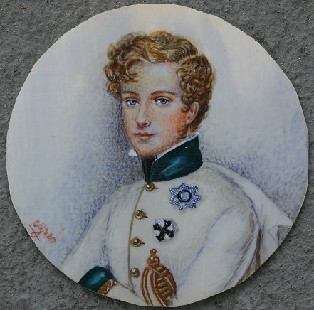 MINIATURE WATERCOLOR ON IVORY PORTRAIT OF A YOUNG MILITARY OFFICER: Circular, measures 2 3/4'' dia., signed lower left ''Agnes'', encased in original brass frame.