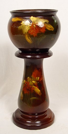 STANDARD GLAZE POTTERY JARDINIERE AND PEDESTAL: Attrib. to Roseville. Matching handpainted floral design on jar and pedestal. Interior crazing on jardiniere, chips along base. The pedestal is in good condition. Jar- 10 1/2'' dia. Ped is 17''h.