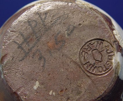NORTH CAROLINA JUGTOWN POTTERY VASE: Drip glaze, stamped Jugtown Ware. 6 3/4''h. The body is 5 1/2'' dia. at the widest.
