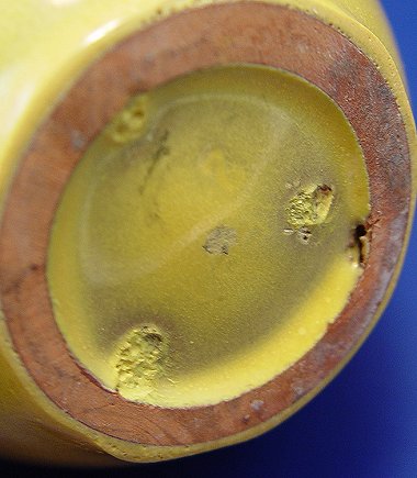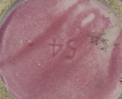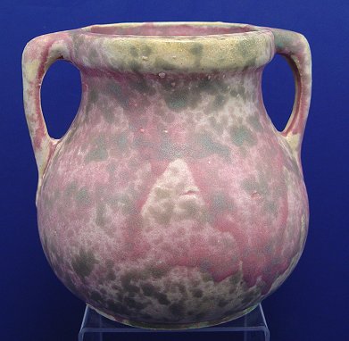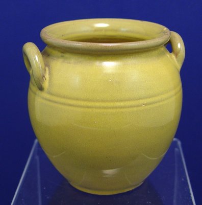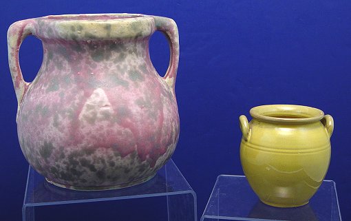 DUO OF ART POTTERY POSSIBLY CARNELIAN: Double handle vase with mottled purple and gray over gray. Carnelian type glaze. 6 1/2''h. Incised number 54 on underside. Sold with a high gloss mustard glaze pot, 3 1/2''h.