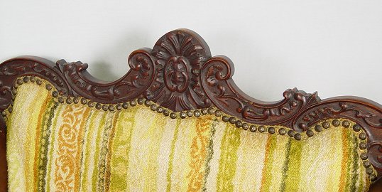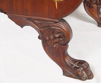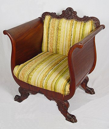 CARVED MAHOGANY ARM CHAIR: High curved sides, carved claw feet on front and splayed legs, carved and shaped top rail. Carved skirt with veneer loss near the center. 34 3/4''h, 30''w x 23 1/4''.