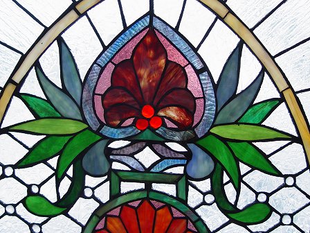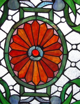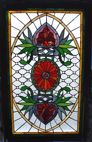 DECORATIVE STAINED GLASS WINDOW: Red bulls-eye center, predominantly red, purple, green, and amber, with a textured clear background. Nicely framed, ready for hanging. Approx. 23 1/4'' x 37 1/2''. Est. $350/450**
