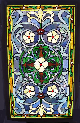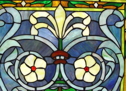 DECORATIVE STAINED GLASS WINDOW: Petal flower and fleur-de-lis motif in blue, green, yellows, and red bulls-eyes. Nicely framed and ready for hanging. Approx. 23 1/4'' x 37 1/2''. Est. $350/450**