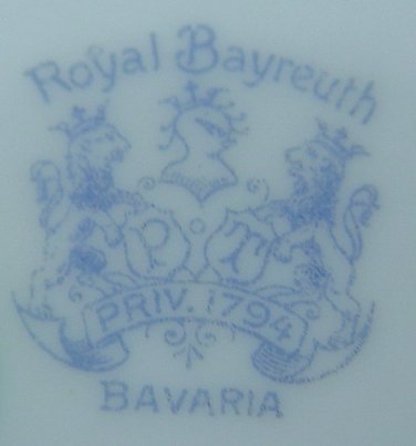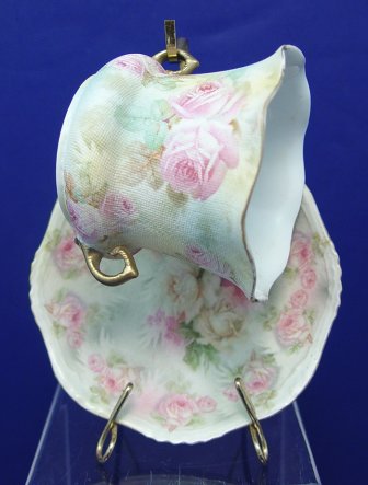 ROYAL BAYREUTH ROSE TAPESTRY CUP AND SAUCER: Double handled, ruffle rim cup. Cup is 2 1/2''h, saucer is 4 1/2'' dia. No chips or cracks. Blue back stamp.