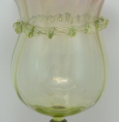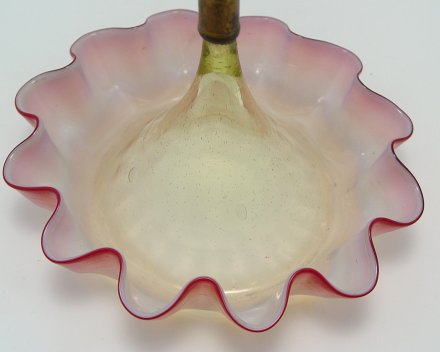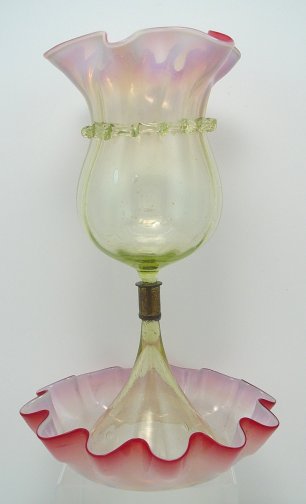 VASELINE AND CRANBERRY VICTORIAN ART GLASS EPERGNE VASE: Single vase epergne with pinched applied banding, on a shaped dish of the same glass. 12 1/2''h, the vase is 5 1/2'' dia. the base is 8'' dia.