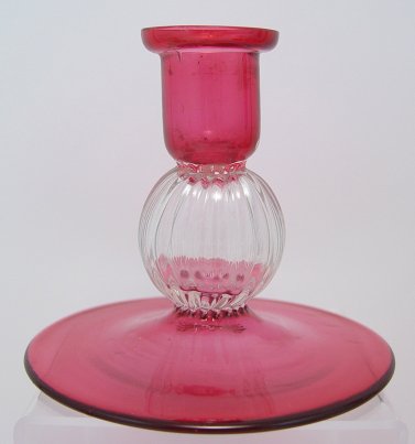 SET OF FOUR STEUBEN QUALITY CRANBERRY GLASS CANDLE HOLDERS: Blown glass with hollow ball stem. 4 1/2''h., 3 3/4'' dia. base. No chips or cracks.