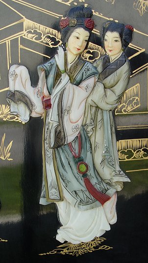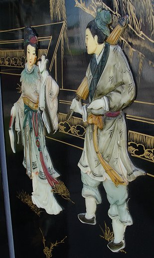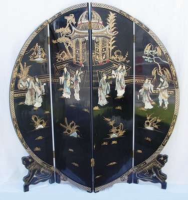 FOUR PANEL ORIENTAL LACQUER SCREEN: In a most unusual round shape. Decorated in molded figures and hand paint gold designs. Approx. 6''h. at the center, opens to 5'10''w. Very slightly worn condition.