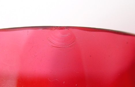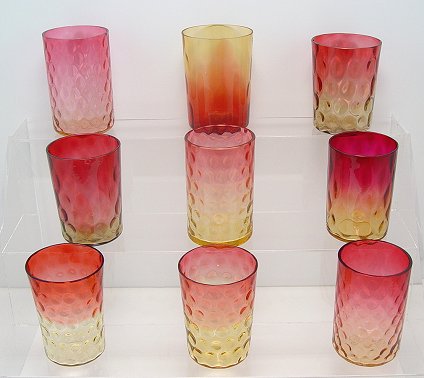 9 INVERTED THUMBPRINT AMBERINA GLASS TUMBLERS: Estate collection of 19th C amberina, 3 7/8''h. Variety of manufacturers.