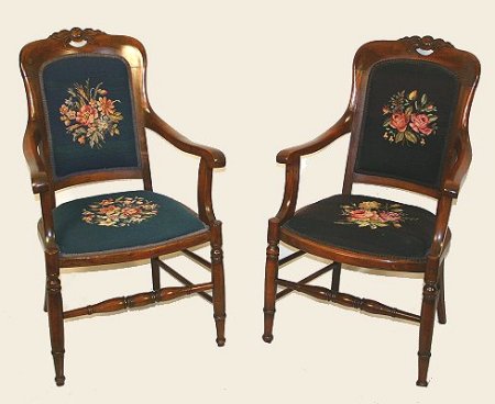 HANDSOME PAIR OF VICTORIAN ROCOCO ARM CHAIRS: Rose carved crest on solid mahogany frame, open arms, turned stretchers. Both with floral needlepoint backs and seats, black ground on one, dark blue on other.