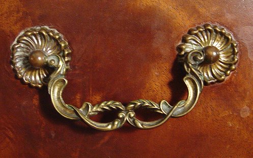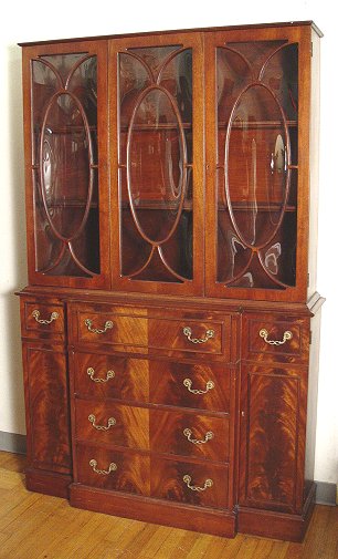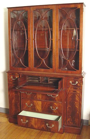 FINE MAHOGANY BREAKFRONT SECRETARY CABINET: Straight cornice, upper section with bubbled glass, lower section has fall front desk on top drawer. 3 lower drawers center cabinet drawer sides. Drawers have painted interior. 75''h, x 49'' x 14''.