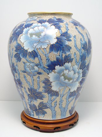 JAPANESE BLUE AND WHITE IMARI VASE attrib. TO FUKAGAWA: Jar shaped vase with large chrysanthemums. Gold squiggle background characteristic of Fukagawa. 13''h. Gold mark.