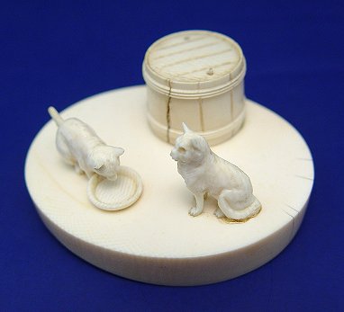 IVORY FIGURAL GROUP: Depicts a pair of cats, one drinking from dish, beside a ''wooden'' keg, on oval base, 3'' x 2 3/8'' x 1 3/8''h.