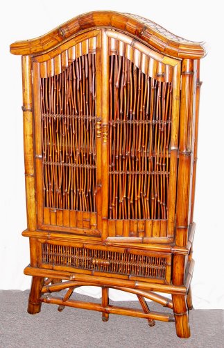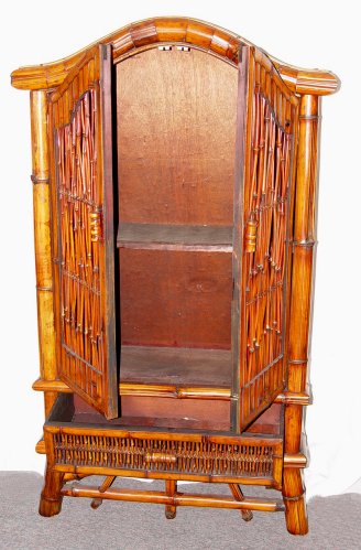 DECORATIVE DIMINUTIVE BAMBOO CABINET: Arched top, one full length drawer across the bottom. One shelf interior. 53 1/2''h, x 30 1/2'' x 12 1/2''. Estate fresh, contemporary manufacture.