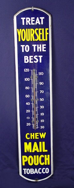 CHEW MAIL POUCH TOBACCO OLD STORE THERMOMETER: Bright cobalt blue, yellow, and white enameled metal. 38 3/4''h, x 7 7/8''.