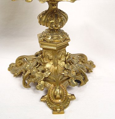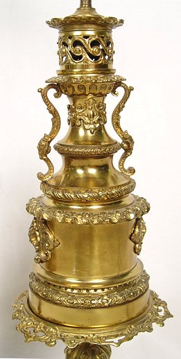 PAIR OF AESTHETIC BRASS TABLE LAMPS: Ornate leaf and floral design. Age and origin unknown. Two pull chain light socket. Brass ornate part is 20''h, 32''h, overall.