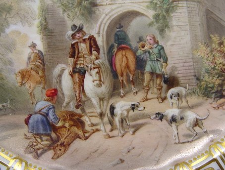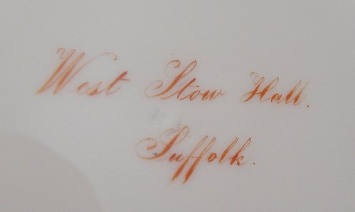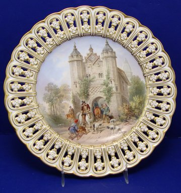 FINE HAND PAINTED PORCELAIN PLATE WITH SCENE OF WEST STOW HALL, SUFFOLK: Reticulated and gilt enhanced fine porcelain plated centering a hand painted image of West Stow Hall with figures after a successful hunt. No chips of cracks. 9'' dia.