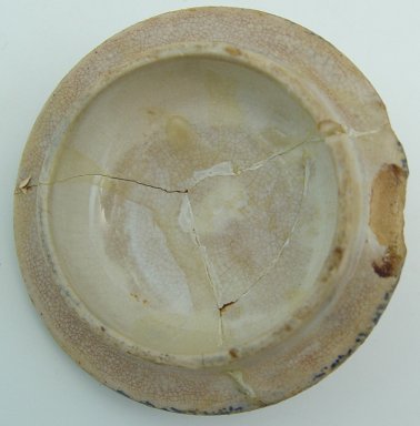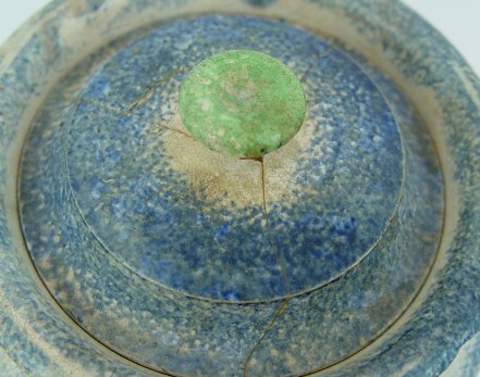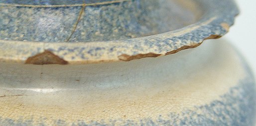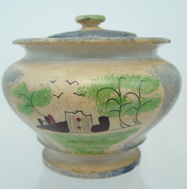 BLUE SPATTERWARE COVERED SUGAR IN THE ''FORT'' PATTERN: 4 1/2''h, 4 1/2'' dia. Please note non professional repair to lid with chipping and chipped condition to rim and base of bowl.