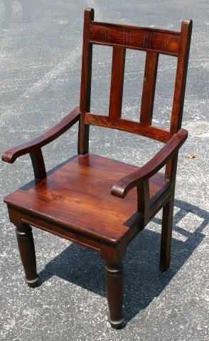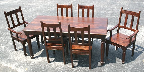 IMPORTED FAMILY SIZE DINING TABLE AND 6 CHAIRS: African dark wood, table is 31''h, x 71'' x 36''. Plank wood seats, two of the chairs are arm chairs.