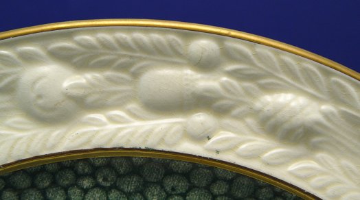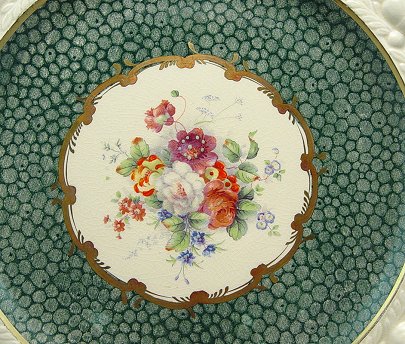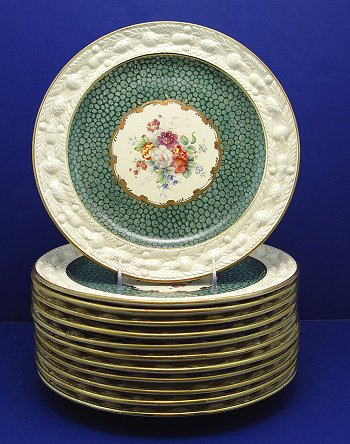 SET OF 12 ADAMS TITIAN WARE SERVICE PLATES: Raised acorn border centering the most elaborate floral center we have seen on Titian Ware yet. 10 3/4'' dia.