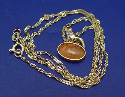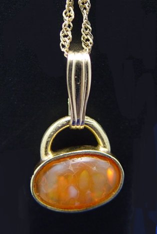 3CT MEXICAN FIRE OPAL PENDANT: Lovely gem full of flash and fire. Correct, untreated stone measuring approx. 7 x 10 x 3.6mm, set in 18k (assayed) yellow gold pendant, currently on an 18'' chain of 14k gold. Est. $400/500**