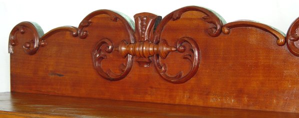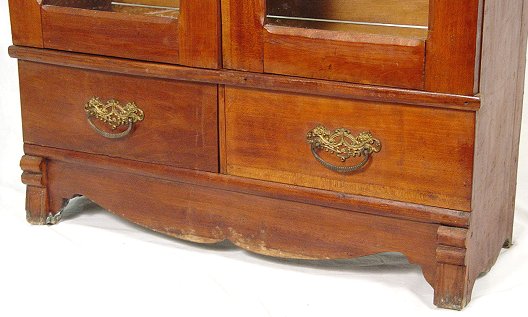 VICTORIAN COTTAGE BOOKCASE CABINET: Tall carved backsplash over double glass door front, wood shelf interior. 54''h, x 38'' x 11''.