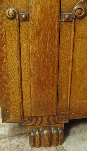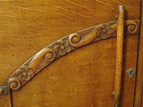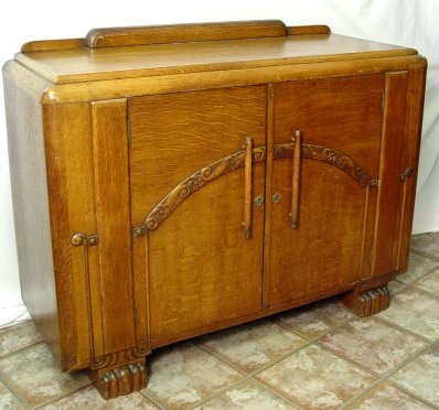 ENGLISH 1930'S ART DECO OAK BUFFET: Interior fitted with bottle holders, shelves, and drawers. 53''H, X 41'' X 21''