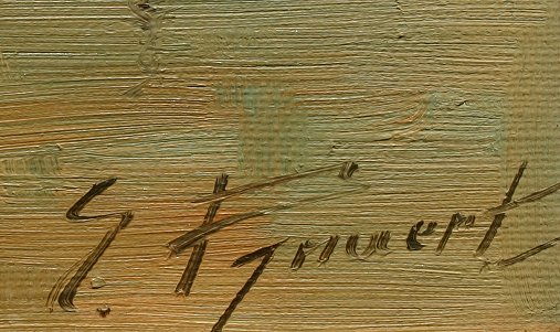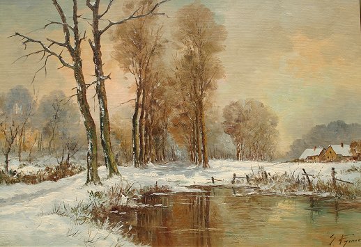 GOOD IMPRESSIONIST WINTER LANDSCAPE ILLEGIBLY SIGNED LOWER RIGHT: O/CB, 24'' x 32'', encased in original plain wood molding with abrasions and wear, 28'' x 36''.