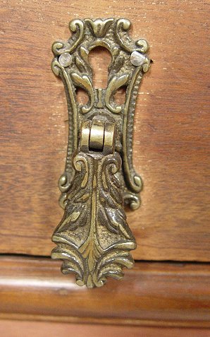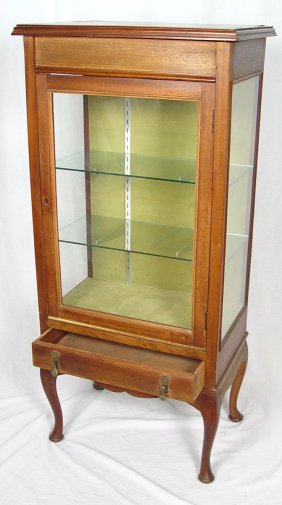 EARLY 20TH C WALNUT CURIO CABINET: Single glass front door over one drawer. Glass shelf and illuminated interior. ornate drop pulls, cabriole legs. 48'' x 21'' x 14''.
