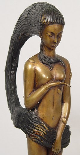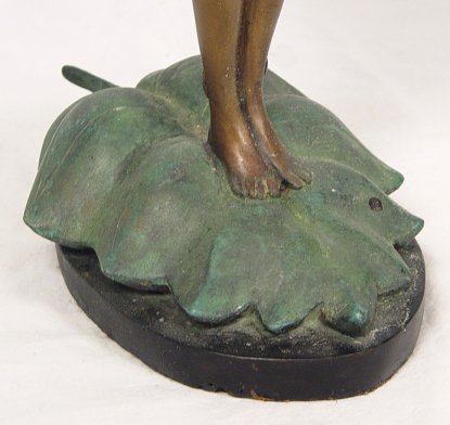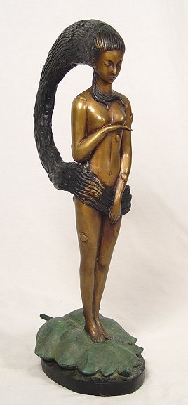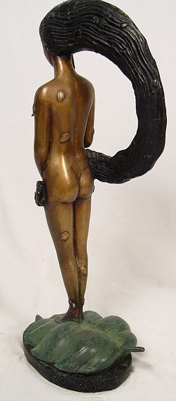 CONTEMPORARY BRONZE SCULPTURE: Ethereal maiden with long black hair blowing in the wind, small leaves scattered about hair and body, perched on a green leaf, 24''h.
