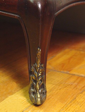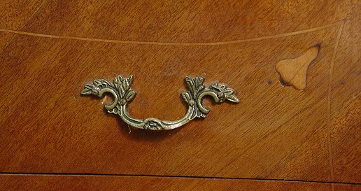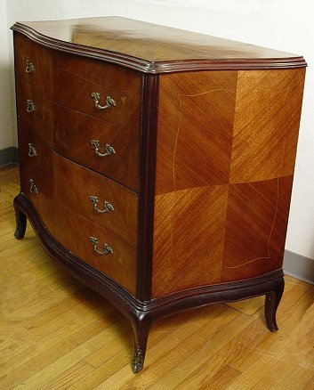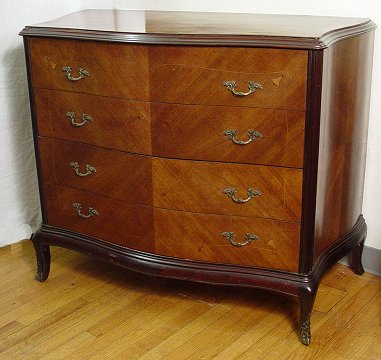 INLAY FRENCH COMMODE CA 1920: 4 drawer serpentine front chest with string inlay, ornate brass pulls, ormolu mounted feet. 36 1/2''h, x 38 1/2'' x 22''. Est. $350/500**