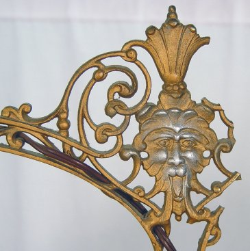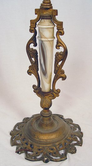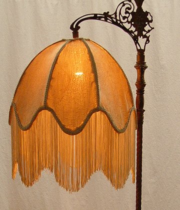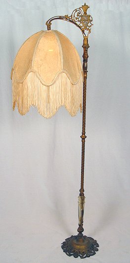 VINTAGE 1920'S FLOOR BRIDGE LAMP WITH AGATE GLASS: Gold colored metal bridge lamp. Note the face figure and agate glass on the pole. The fringed shade is in aged condition. 61 1/2''h.