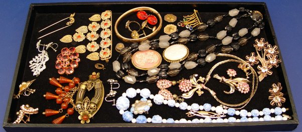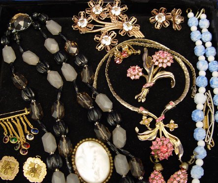 TRAY LOT OF ESTATE COSTUME JEWELRY: To include such makers as Kass Melcer NYC, Coro, West Germany. Items to include, pink rhinestone ensemble, gold filled bangle, single cuff links, necklaces, brooch earring sets, etc. Sold as a lot.